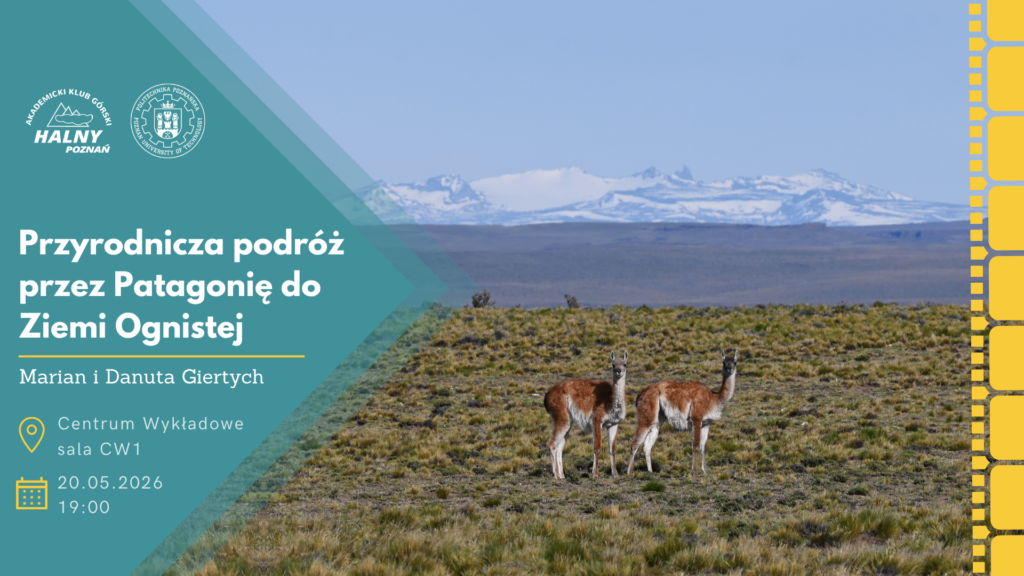 Akademicki Klub Górski „Halny” serdecznie zaprasza studentów, absolwentów, członków Klubu oraz wszystkich pozostałych sympatyków turystyki na kolejną prelekcję, która odbędzie się w środę 20.05.2026 r. o godzinie 19:00 w sali CW1 w Centrum Wykładowym Politechniki Poznańskiej (na prawo od głównego wejścia). Tym razem wybierzemy się na sam południowy kraniec Ameryki Południowej 🙂 Do Patagonii i Ziemi Ognistej zabiorą nas: Danuta Giertych, miłośniczka roślin górskich, oraz Marian Giertych, pasjonat ptaków i profesor w Instytucie Dendrologii PAN. Poza opowieścią podróżniczą nie zabraknie więc też okazji do dopytania o przyrodniczą charakterystykę tego rejonu 🙂