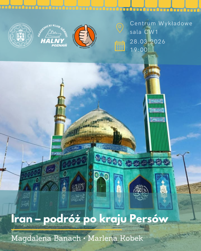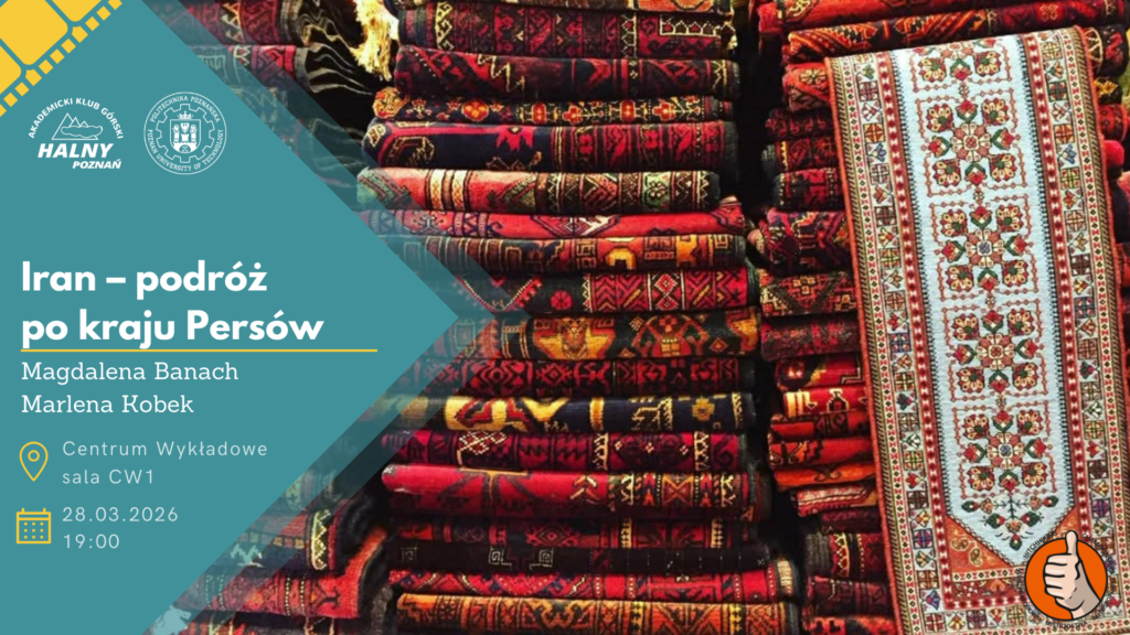 Akademicki Klub Górski „Halny” serdecznie zaprasza studentów, absolwentów, członków Klubu oraz wszystkich pozostałych sympatyków turystyki na kwietniową prelekcję, która odbędzie się jeszcze w marcu 🙂 Prelekcja odbędzie się w sobotę 28.03.2026 r. o godzinie 19:00 w sali CW1 w Centrum Wykładowym Politechniki Poznańskiej (na prawo od głównego wejścia). O swojej autostopowej wyprawie do Iranu, opowiedzą Magdalena Banach i Marlena Kobek, które przedstawią nam także zasady udziału w Międzynarodowych Mistrzostwach Autostopowych.