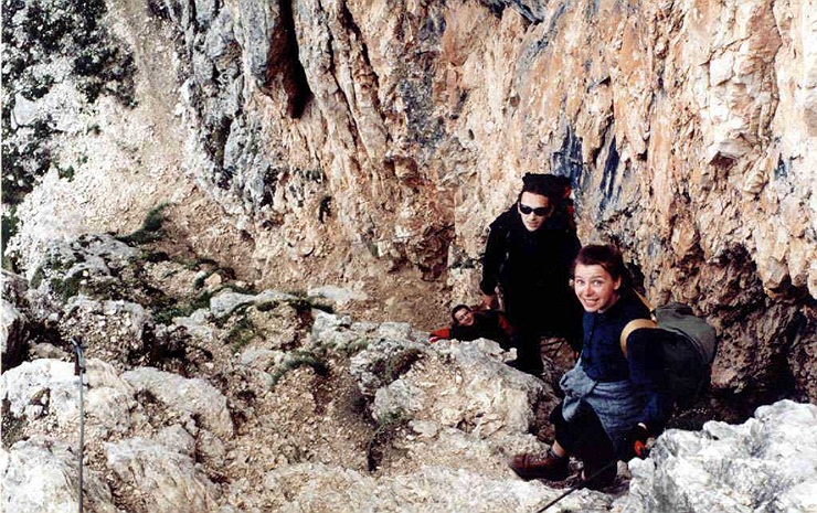Dolomity są znane ze swoich asekurowanych szlaków zwanych lokalnie „via ferrata”, czyli dróg żelaznych (niem. Klettersteig). Wzdłuż szlaku jest prowadzona stalowa linka, co jakiś czas przymocowana do skały. Tu (23) widzimy fragment ferraty poprowadzonej w okolicy Auronzo. Kamienie pokryte sugestywnego koloru porostami, a w tle malownicza serpentynka. Widać równerz fragment linki (koniecznie musi być dynamiczna), która powstrzymywała mnie przed przedwczesnym zakończeniem robienia tego zdjęcia. Dobrze ... delikwent wskakuje więc w uprząż wspinaczkową i za pomocą jednometrowego (tak około - liczę odległość od uprzęży do linki, bo sama lina jest ponad 2 razy dłuższa) i za pomocą karabinków wpina się w ferratę. On (ew. ona) i góry od tej pory stanowią rozłączaną, lecz tylko na własne życzenie całość. Tu (15) widzimy fazę oswajania się ze sprzętem na naszym kempingu. Ferraty są dużo bezpieczniejesze od naszych tatrzańskich łańcuchów, które można w każdej chwili puścić ... Dodatkowo _niezbędny_ jest kask, najlepiej specjalny wspinaczkowy. W moim przypadku egzamin zdał model (desko-) rolkowy pożyczony od brata.