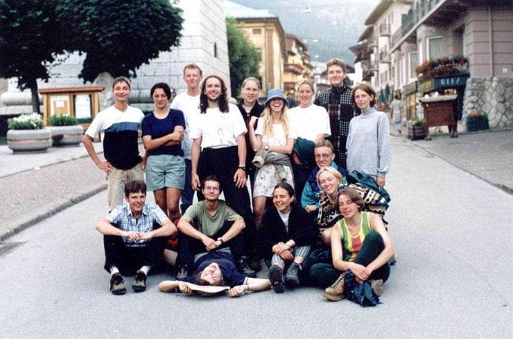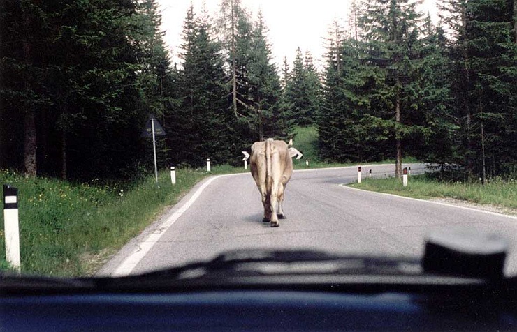 Wyjazd w Dolomity był oficjalnym wyjazdem klubowym Halnego, co oznaczało mniej wiecej tyle, iż wśród nasz wszystkich (20) było mniej więcej 3 członków klubu. Całą resztę stanowili „członkowie sympatycy”, do których zaliczam się i ja. Pierwsza rzeczą, którą trzeba było zrobić by być w Dolomitach, było dotarcie na miejsce. Można tu było wyróżnić dwie metody: pociągowo-stopową, oraz full-stopową. Ta pierwsza polegała na przejechaniu całego obszaru Niemiec na tzw. Wochenendeticket (korzystając z którego można tanio przemierzyć całe Niemcy w jedyne paręnaście przesiadek). Agnieszka (pomysłodawca - tu widziana z profilu w trakcie picia wody ze strumienia (33) oraz ja przejechaliśmy w ten sposób od Wrocławia, aż po Cortine d'Ampezzo (25 - tu widziana już z gór) w dwa dni. Podróż wspominam bardzo miło. Końcówkę podróży odbyliśmy Toyotą Land Cruiser (13) z miłą parą. Napomknę jeszcze, iż on miał na koncie starty w rajdzie Paryż-Dakar. Na miejscu, ze względu na kiepską komunikacje autobusową, stop był również często wykorzystywanym środkiem transportu. Zawsze było ciekawie, jak np. wtedy gdy jechaliśmy przez parę minut jakieś 2 ... no może 3 km na godzinę ... (18) Ilekroć nasz kierowca próbował wyminąć krowę, nadjeżdżało coś z naprzeciwka :-).