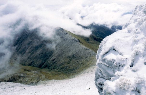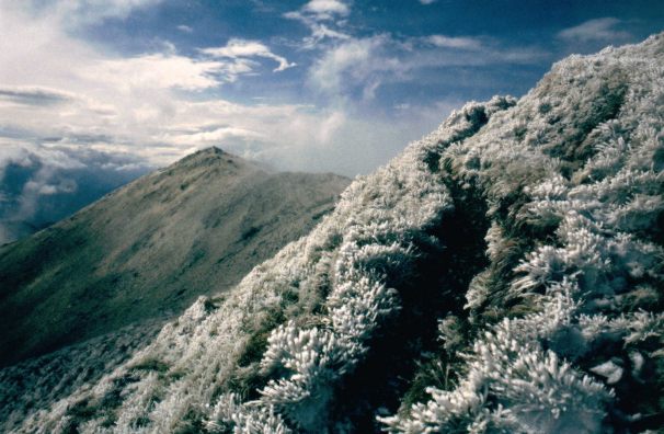 Całą noc padał deszcz. Na dodatek wiał wiatr, który poluzował odciągi naszego namiotu i w efekcie przy większych podmuchach składał namiot, powodując jego przeciekanie. Nie wiem, ile tej nocy spałem, ale nie było tego wiele. Nad ranem temperatura spadła poniżej zera i deszcz zamienił się w śnieg. Dzięki temu namiot pokrył się warstewką lodu i przestał w końcu przeciekać. Około ósmej przestało padać, ale nadal byliśmy w chmurach i nie było widać jakichś szczególnych znaków poprawy pogody. Postanowiliśmy zejść poniżej pułapu chmur w stronę wsi Valea Vinului do miejsca, gdzie znajdziemy drewno na ognisko i będziemy mogli się wysuszyć. Zagrzaliśmy sobie na epigazie wodę na musli, spakowaliśmy się i o 11:15 zaczęliśmy podchodzić z powrotem na przełęcz Şaua cu Lac z zamiarem zejścia z niej w dolinę po drugiej stronie grani szlakiem niebieskich kropek. Trawy przyprószone śniegiem wyglądały bardzo malowniczo. Podchodziliśmy cały czas w chmurach, ale im bliżej byliśmy przełęczy, tym niebo nad nami stawało się jaśniejsze. Gdy dotarliśmy na przełęcz przez chmury zaczęły się przebijać coraz większe kawałki błękitu i wyglądało na to, że wychodzimy ponad warstwę chmur. W związku z zaistniałymi okolicznościami postanowiliśmy zmienić nasze plany i zamiast schodzić w dolinę wejść na Ineu. Im wyżej wchodziliśmy, tym bardziej potwierdzała się słuszność tego wyboru. Okoliczny krajobraz wyglądał wręcz bajkowo i trochę nierealnie. Rude trawy przykryte kilkucentymetrową warstwą śniegu, błękitne niebo i przelewające się mleko chmur. Aparaty natychmiast poszły w ruch. Gdy weszliśmy na Ineu nie mogliśmy się napatrzyć na widoczny wokół nas krajobraz. Szczyt wystawał ponad przelewającymi się ze wschodu na zachód przez główną grań chmurami. Nie wróżyło to niestety dobrze naszej dalszej trasie, bo wyglądało na to, że widoki po zejściu z Ineu będą mizerne. Dlatego też opóźnialiśmy ten moment jak tylko się dało. W końcu jednak przemówił do nas rozsądek i zaczęliśmy schodzić ze szczytu. Śnieg bardzo szybko topniał - w miejscach, gdzie brnęliśmy przez niego na podejściu teraz płynęły strumyki wody. Zeszliśmy do miejsca, gdzie szlak przechodzi w trawers Ineu i już we mgle ruszyliśmy wzdłuż grzbietu Ripa Coasta Neteda. Po dojściu do przełęczy Tarniţa lui Putredu postanowiliśmy zejść szlakiem niebieskich trójkątów gdzieś poniżej chmur i znaleźć jakieś dobre miejsce na wysuszenie mokrych rzeczy. Znaleźliśmy takie na trawiastej półce otoczonej niskimi zaroślami jakieś 200 m poniżej grani. W pobliżu płynął strumyk i pełno było suchych gałęzi aż się proszących o ogień. trzeba było tylko uprzątnąć trochę końskich i krowich kup oraz kamieni i miejsce było idealne. Było koło 16:00 i akurat ładnie zaczęło przygrzewać słoneczko. Rozpaliliśmy ognisko i rozwiesiliśmy na krzakach nasz mokry dobytek. Na kolację postanowiliśmy sobie zrobić dla odmiany kaszę z soją i warzywami. Wyszło całkiem smacznie, choć następnym razem trzeba będzie ciut dłużej pogotować kaszę, bo trzeba ją było trochę przeżuwać. Dzięki słońcu i ognisku rzeczy nam szybko wyschły. Wieczór spędziliśmy na siedzeniu przy ognisku i grze w tysiąca (wygrał Miron).