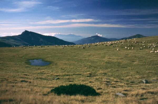 Przy wtórze wystrzałów zaczęliśmy podchodzić drogą w stronę głównej grani Rodniańskich, mijając po drodze szałasy pasterskie i stada owiec. Podczas trawersu szczytu Vf. Gajei (1847 m) spotkaliśmy pierwszą grupkę plecakowych turystów - szóstkę Czechów kończących swoją wędrówkę przez Rodniańskie. Około 14:00 dotarliśmy do miejsca, gdzie płaj, którym dotąd szliśmy się kończył i zaczynało się strome podejście na Ineuţ. Zrobiliśmy tu sobie przerwę na obiad, po czym zaczęliśmy mozolnie wspinać się pod górę. Celu wspinaczki nie było widać, gdyż szczyt spowity był chmurami. I my również z każdym krokiem zbliżaliśmy się do spotkania z nimi. Gdy w nie wkraczaliśmy dotarły do nas pierwsze krople (jak to Miron określił) „opadów konwekcyjnych”. Im wyżej wchodziliśmy, tym tych opadów było więcej, od czasu do czasu modyfikujących swą postać w grad. Nie było widać końca tej drogi, bo we mgle każde kolejne wzniesienie wydawało się być tym właśnie końcowym szczytem, ale nie było. Gdy w końcu stanęliśmy w miejscu, z którego wyżej już się iść nie dało (o czym upewnił nas drogowskaz Ineuţ 2222 m), byliśmy już mocno przemoczeni i zmarznięci. Nie siedzieliśmy więc tam długo, lecz zaczęliśmy schodzić w stronę przełęczy Şaua cu Lac. Gdy do niej dotarliśmy mgła od północnej strony na moment się rozwiała i zobaczyliśmy w dolinie strumyk i miejsce dające szansę na rozbicie namiotów. Było około 17:00, więc postanowiliśmy tam zejść i zakończyć wędrówkę na dzisiaj. Po zejściu okazało się, że nie my pierwsi wpadliśmy na ten pomysł - znaleźliśmy tam ogrodzone murkiem z kamieni miejsce na namioty oraz niestety sporo śmieci. Deszcz ciągle padał, więc szybko rozbiliśmy namioty, zrzuciliśmy mokre ciuchy i przebraliśmy się w suche. Gdy już trochę odtajaliśmy postanowiliśmy zrobić w naszym namiocie jedzenie i herbatę. Na wielkie przygotowania posiłku nikt nie miał siły, więc skończyło się na kabanosach z chlebem. Na Epigazie zagrzaliśmy wrzątek i zrobiliśmy po symbolicznej porcji herbaty. W końcu zrobiło się ciemno i poszliśmy spać.