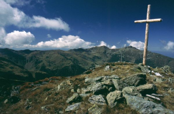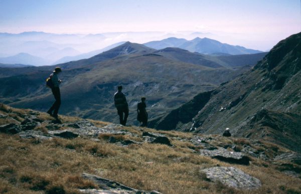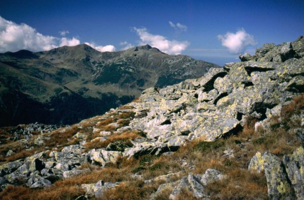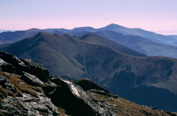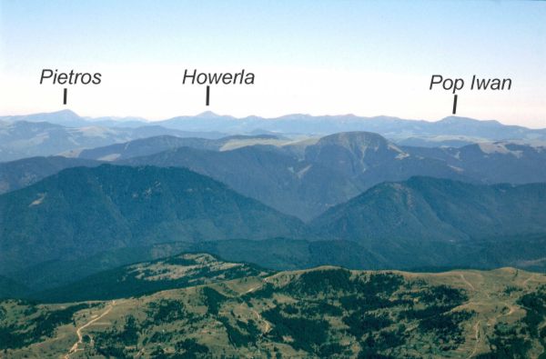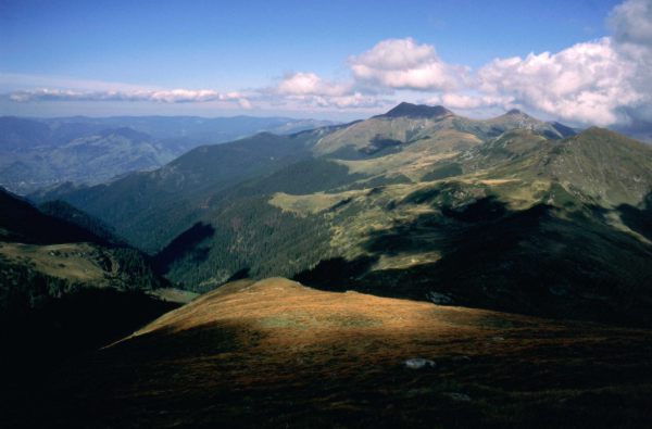 Przy planowaniu trasy przez Rodniańskie początkowo miałem zamiar zakończyć wędrówkę granią wejściem z plecakami na Vf. Pietrosu i zejściem z niego do Borşy. Ale skoro dzisiaj jest sobota, to rozwiązanie takie trochę nie miałoby sensu, bo w sobotę po południu lub w niedzielę nie kupilibyśmy map ani kartek pocztowych i znaczków, żeby je wysłać znajomym. Dlatego postanowiliśmy przedłużyć wędrówkę granią tak, aby do Borşy zawitać w poniedziałek, a Vf. Pietrosu zdobyć bez plecaków (leży od w bok od głównej grani). Na śniadanie zjedliśmy tradycyjne musli, spakowaliśmy się, schowaliśmy plecaki pod skałką i około 9:30 ruszyliśmy na szczyt. Trasa wiodła przez szczyty Buhaescu Mare (2119) i Rebra (2221). Na tym ostatnim dogoniliśmy znajomą parkę Niemców, którzy wyszli na szczyt przed nami. Z Vf. Rebra ostro zeszliśmy na przełęcz Pietrosului, a potem ponownie do góry na Vf. Pietrosu. Droga na szczyt zajęła nam w sumie około 2 godzin. Na szczycie stoi murowana z kamieni budka, zrujnowana i otoczona resztkami drutu kolczastego. Prawdopodobnie była to stacja meteorologiczna. Posiedzieliśmy sobie na szczycie z pół godzinki robiąc zdjęcia i oglądając panoramkę. Widać było dokładnie przebytą przez nas trasę z wyrastającym na jej początku Ineu, dolinę Vişeu z rozciągającą się wzdłuż niej Borşą oraz leżące po jej przeciwnej stronie Karpaty Marmaroskie z wystającym na pierwszym planie masywem Trojagi. Za Karpatami Marmaroskimi wyraźnie było widać Czarnohorę od Popa Iwana po Howerlę i Pietrosa. Gdy już się wszystkiego naoglądaliśmy, zeszliśmy z powrotem na przełęcz Pietrosului, lecz zamiast wchodzić na Vf. Rebra postanowiliśmy go strawersować. Rozwiązanie to okazało się jednak niezbyt godne polecenia, bo trawers po kamieniach i stromych trawiastych zboczach trwał tyle samo, ile zajęłoby nam przejście granią, a na dodatek było mniej bezpieczne. Ale przynajmniej nie wracaliśmy tą samą drogą, a na trawersie trafiliśmy na świstaka. Gdy dotarliśmy do naszych plecaków było parę minut przed drugą. Słonko ładnie przygrzewało, więc korzystając z okazji postanowiliśmy wykąpać się w strumyku. Później poleżeliśmy sobie jeszcze trochę na słonku. W końcu koło 15:00 postanowiliśmy ruszyć dalej. W planie mieliśmy znalezienie miejsca w lesie, z dużą ilością drewna, gdzie będziemy mogli zrobić sobie ognisko i w końcu ugotować porządną kolację. Z przełęczy Tarniţa La Cruce ruszyliśmy szerokim płajem, wypchanym chyba niedawno przez spychacz. Droga była wygodna, ale mało ciekawa i monotonna. Prowadziła nas w stronę przełęczy Pietrii, początkowo przez górskie łąki, a potem dość stromo w dół przez poorany wyrębami las. Drewna na ognisko było wszędzie mnóstwo, ale brakowało ciągle jakiegoś fajnego strumyka. Doszliśmy w końcu do przełęczy Pietrii, gdzie spotkaliśmy dwóch drwali tnących bele na kilkumetrowe kawałki i ładujących je na samochód. Na przełęczy pożegnaliśmy się ze szlakiem czerwonego paska i zaczęliśmy schodzić na północ drogą w kierunku Moisei. Po około 20 min. dotarliśmy do miejsca, gdzie droga przecinała potok Ciungii i tam na małej górce wśród choinek znaleźliśmy miejsce na namioty. Opału było pod dostatkiem, więc zaraz zrobiliśmy ognisko i ugotowaliśmy resztę kaszy z soją i suszonym warzywkiem. Dzisiejsze schodzenie z 2300 na około 1100 dało nam się we znaki i przyjemnie było sobie w końcu odpocząć siedząc przy ognisku i wpatrując się w iskry ulatujące na spotkanie z rozgwieżdżonym niebem.