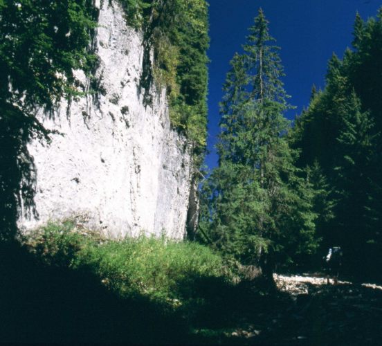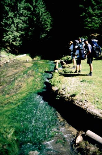 Dzisiaj nie musimy się nigdzie spieszyć, bo w planach mamy tylko dojście gdzieś w okolice Borşy, aby w poniedziałek mieć do niej w miarę blisko. W związku z tym śpimy do 9:00, potem robimy sobie śniadanie w postaci mieszanki zupek w proszku, pakujemy się i w drogę ruszamy dopiero koło 12:00. Pogoda nadal bez zmian - świeci słońce, prawie nie ma chmur. Schodzimy dalej drogą w stronę Moisei aż docieramy do stojącej przy drodze leśniczówki i rezerwatu „Izvorul Alabastru al Izei” czyli „Błękitne źródło Izy”. 150 m w bok od drogi wybija spośród skał podziemny strumień o wodzie w odcieniu siwo-niebieskim. Obok źródła jest dobre miejsce na ognisko, rozbicie namiotów i ogromna wiata, gdzie można się schronić przed deszczem. Od rezerwatu zaczęliśmy podchodzić suchym korytem potoku w górę, w stronę przełęczy oddzielającej nas od sąsiedniej równoległej doliny. W dolinie tej znajduje się Monastyr Moisei, który zamierzaliśmy odwiedzić. Mimo, że wędrówka korytem była dość męcząca to trud się opłacił, gdyż szliśmy wąwozem wśród wysokich skał i momentami wyglądało to podobnie do szlaków w Słowackim Raju. Woda w korycie to się pojawiała, to znów znikała pod ziemią i prawdopodobnie ostatecznie wypływała właśnie w rezerwacie. Wyszliśmy z wąwozu prosto na przełęcz i zeszliśmy w dolinę po drugiej stronie drogą do zwózki drewna. Kawałek drogi przed monastyrem spotkaliśmy bardzo sympatycznego dziadka, który wyglądał na oko na 100 lat i próbował z nami rozmawiać. Trudno go było trochę zrozumieć (zwłaszcza przy naszej znajomości rumuńskiego), ale wywnioskowaliśmy, że dziadek był w Polsce podczas wojny i chodziło tu chyba o I Wojnę światową. Wyglądał tak, że mogło to być prawdą. Po paru minutach od spotkania z dziadkiem dotarliśmy do monastyru Moisei. Nie jest on jakąś specjalną rewelacją - murowany kościół pochodzi z 1901 roku. Ciekawsze są stojące przed kościołem dwa drewniane zabytki - mały kościółek i chałupa bogato zdobiona rzeźbieniami. Duże wrażenie zrobiły na nas też zwykłe wiejskie chałupy, które widzieliśmy chwilę potem w drodze z monastyru do Moisei. Wsie rumuńskie mają swój specyficzny klimat i nawet nowo budowane domy swym stylem nawiązują do tradycyjnych wiejskich zabudowań. Była niedziela i zastanawialiśmy się, czy trafimy na jakiś otwarty sklep, więc gdy znaleźliśmy pierwszą otwartą budkę nabyliśmy w niej trochę deficytowego w ostatnich dniach towaru - piwo i ciastka. Im bliżej byliśmy centrum wsi, tym więcej spotykaliśmy otwartych sklepów z coraz większym wyborem towarów. Trafiliśmy też w końcu na otwartą knajpę, gdzie zamówiliśmy sobie mici i piwo. Mici były takie sobie, ale dostaliśmy do nich sporo świeżego chleba, który nam chyba bardziej smakował niż kiełbaski.